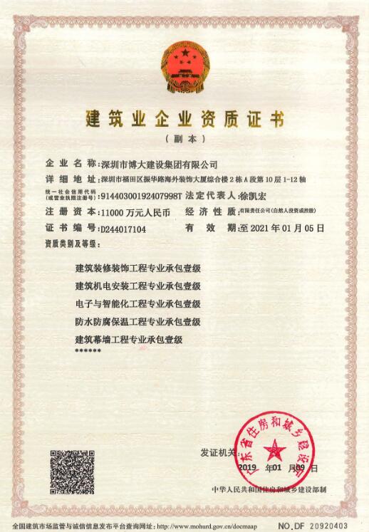 繼獲得展覽工程企業(yè)壹級(jí)、展覽陳列工程設(shè)計(jì)與施工一體化壹級(jí)、潔凈工程壹級(jí)資質(zhì)之后,這是博大半年內(nèi)獲得的又一個(gè)壹級(jí)資質(zhì)。夢(mèng)想有多高,收獲就有多大,博大平臺(tái)資質(zhì)建設(shè)速度前所未有。