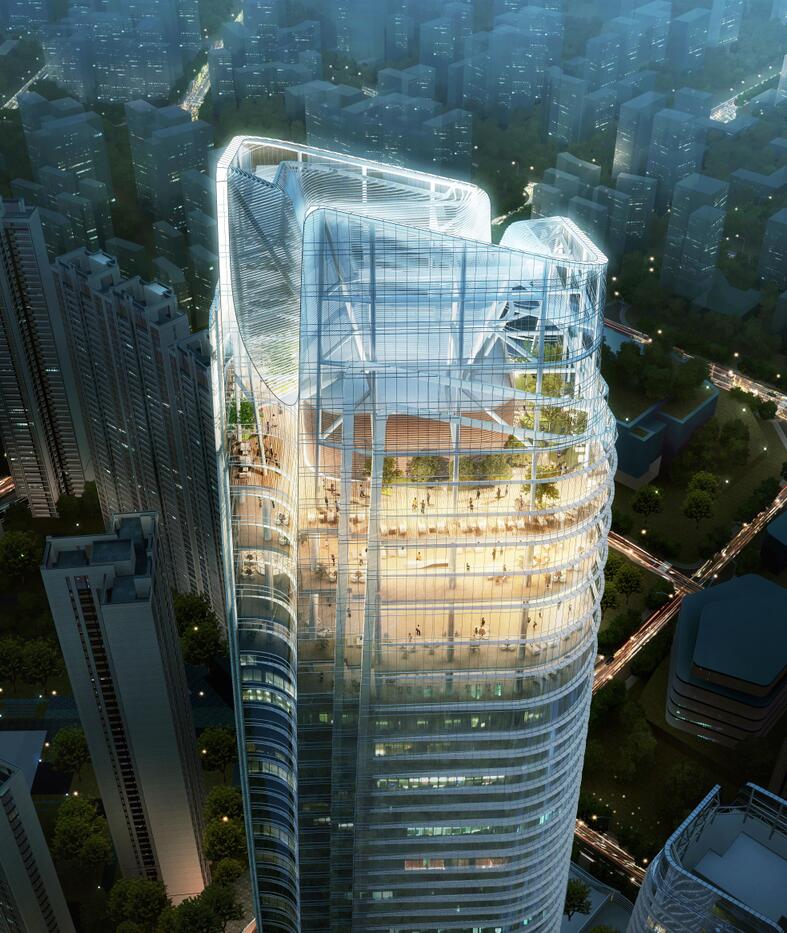 該項目是華僑城集團投資建設(shè)的第一個超高層全異形單元式幕墻,整體造型復(fù)雜、穿插疊合、相互連接,且幕墻系統(tǒng)分散,工作面廣,施工難度系數(shù)極高,為國內(nèi)首例。