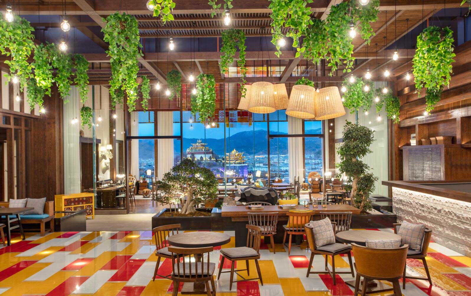 酒店大堂大氣而不失現代藝術美感,走進其間,隨處可見極具當地風格的藝術品與裝飾,隱約可見香巴拉的縮影。頂部設計對光影的巧妙運用可謂巧奪天工,自然光線透過鏤空屋頂灑落下來,與地面交相輝映,且在高原寒冷地區用特色小景、綠植裝點,讓人如同置身熱帶溫室,光影交錯間,營造出“眼有星河,心藏日月”的詩意畫面。