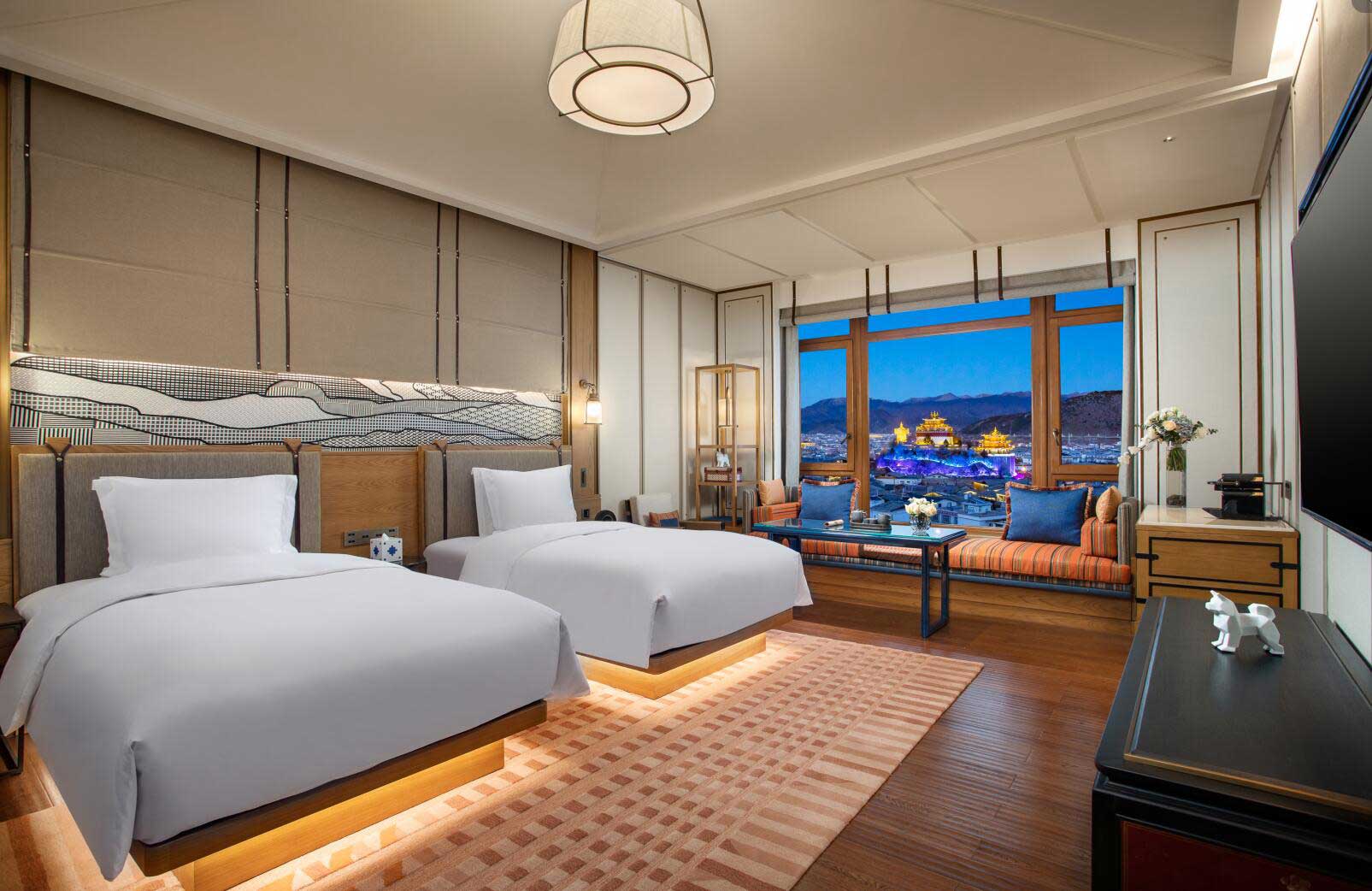 酒店共設99間“月光城”主題客房和3間自帶超大露臺的套房,精巧融合民族文化與國際品牌需要的舒適設計,客房內外藏地藝術與現代精雕細琢的工藝品、壁畫點綴其間,各處細節均體現了英迪格品牌所倡導的“鄰里文化”。各層不同客房設置的入戶庭院、露臺、陽臺,使人獨享私人靜謐空間。