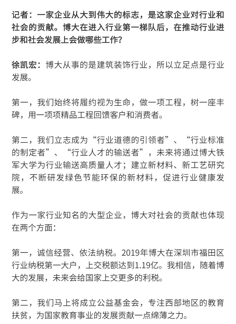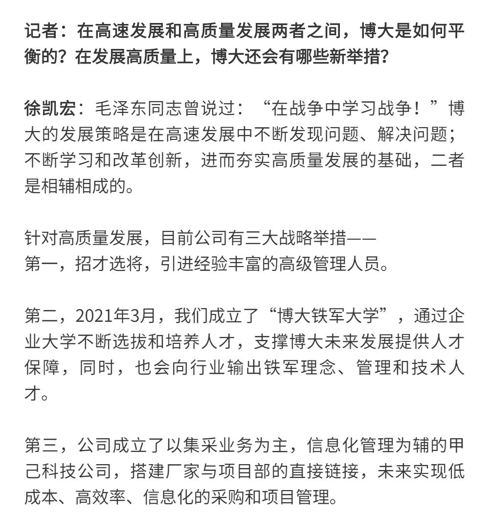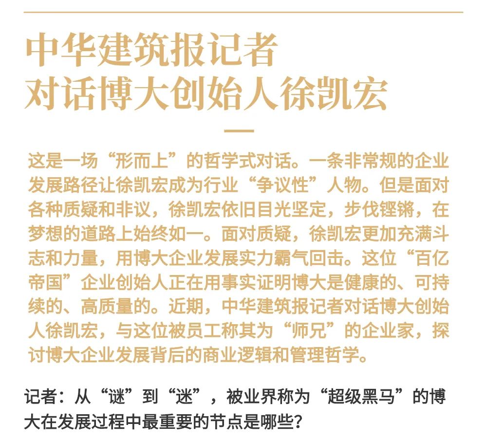 博大以雷霆之勢迅速崛起,吸引了行業的高度關注,行業權威媒體《中華建筑報》數次深入博大一線調研走訪,并對創始人徐凱宏先生進行了坦誠的訪談,以探討和總結博大發展的秘籍,并寫就了《進擊的博大:從高速到高質量的創新逆襲》和《對話徐凱宏 | 博大正沿著高質量發展道路堅定前行》兩篇文章。
